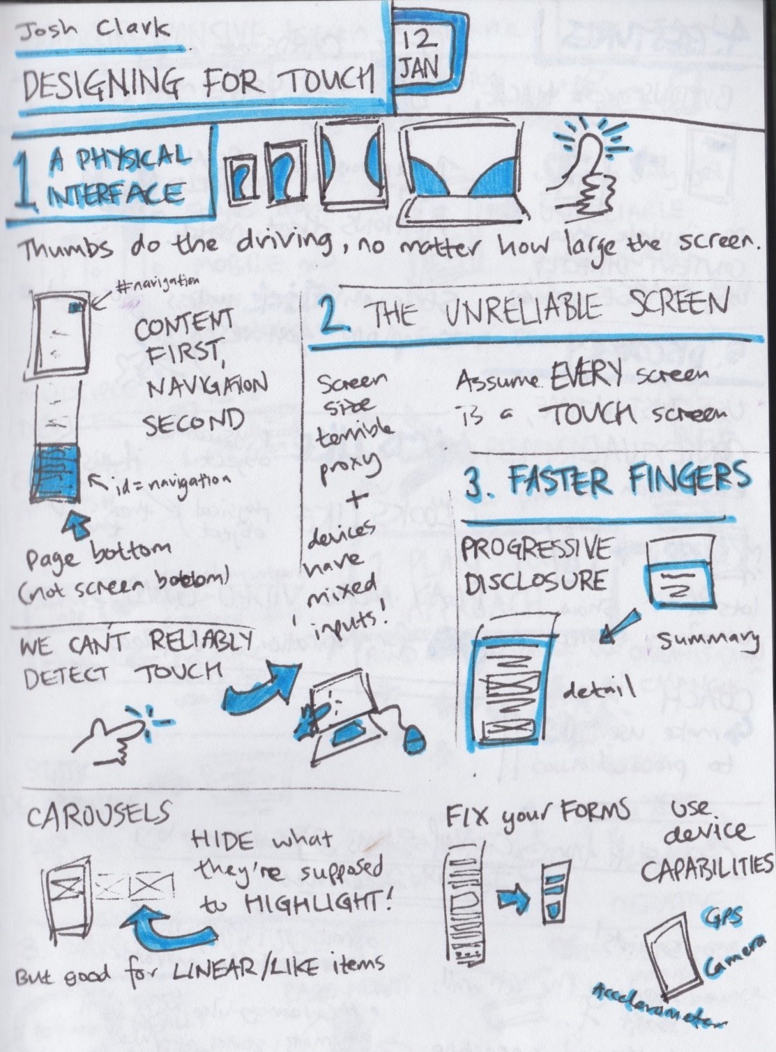 Over the holidays I took the chance to catch up on some reading. One of the books I read was Josh Clark’s Designing For Touch from A Book Apart. Here are some quick thought and sketchnotes.