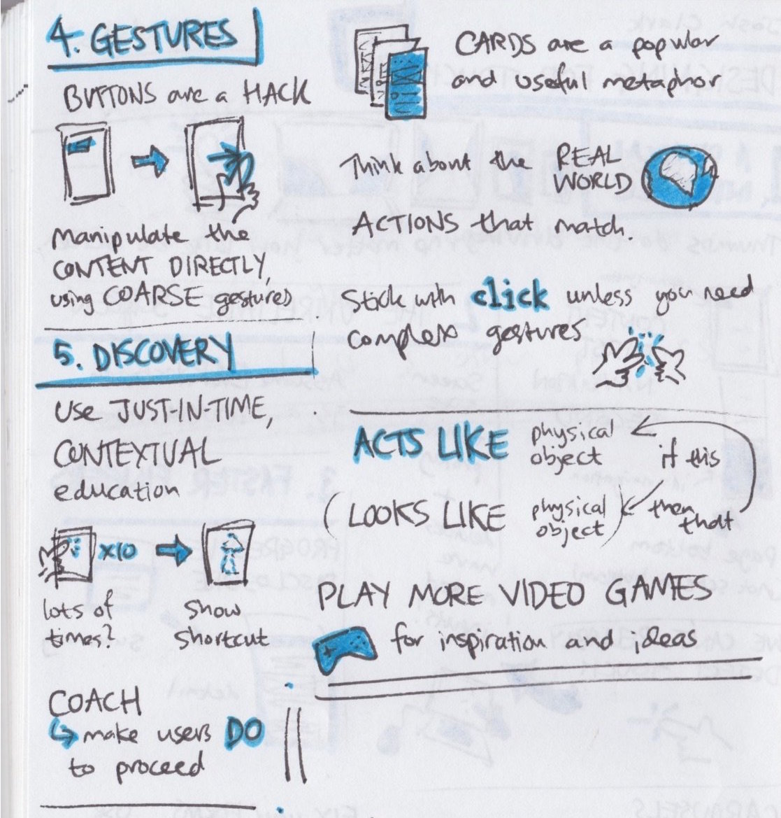 That leads on to thinking about letting the user manipulate the content directly, using coarse gestures: big sweeping movements that fling things around. Clark also talks about matching actions with the real world: if something on the screen looks like something in the real world, it must act like it.