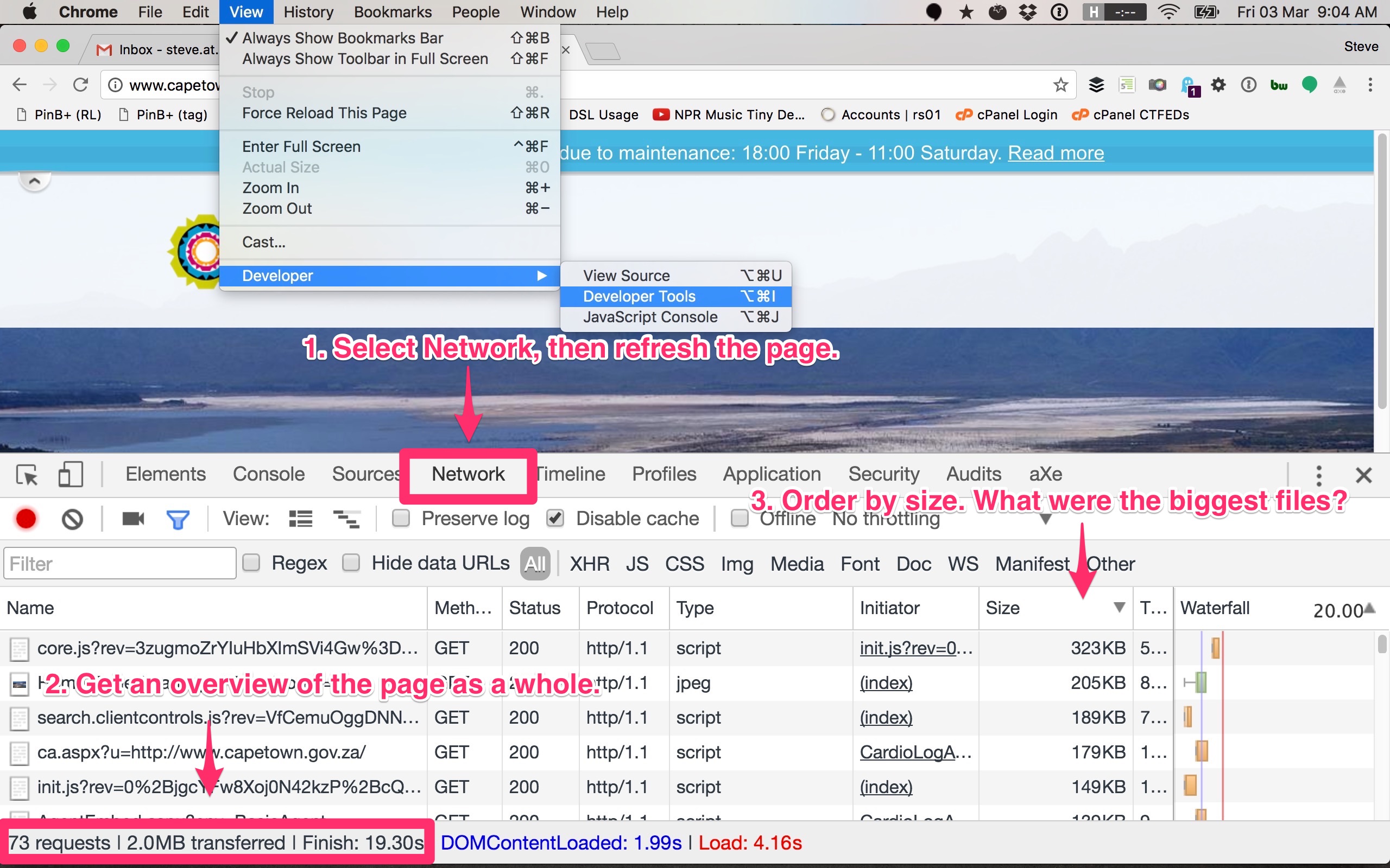 Chrome’s DevTools have a lot in them, but looking at just the Network tab can give you a good, quick, overview of the general performance state of a page. Open DevTools, select the Network tab, then reload the page. At the bottom of the Network tab you’ll see the number of requests (smaller is better), the size of the page (MBs transferred, smaller is better), and how long the page took to Finish loading (quicker is better).
