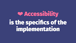 ❤ Accessibility is the specifics of the implementation. The W3C Web Accessibility Initiative (WAI) says: