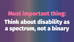 The most important thing is to think about disability as a spectrum, not a binary. This helps more humans, on more devices and browsers, under more conditions, use our stuff.