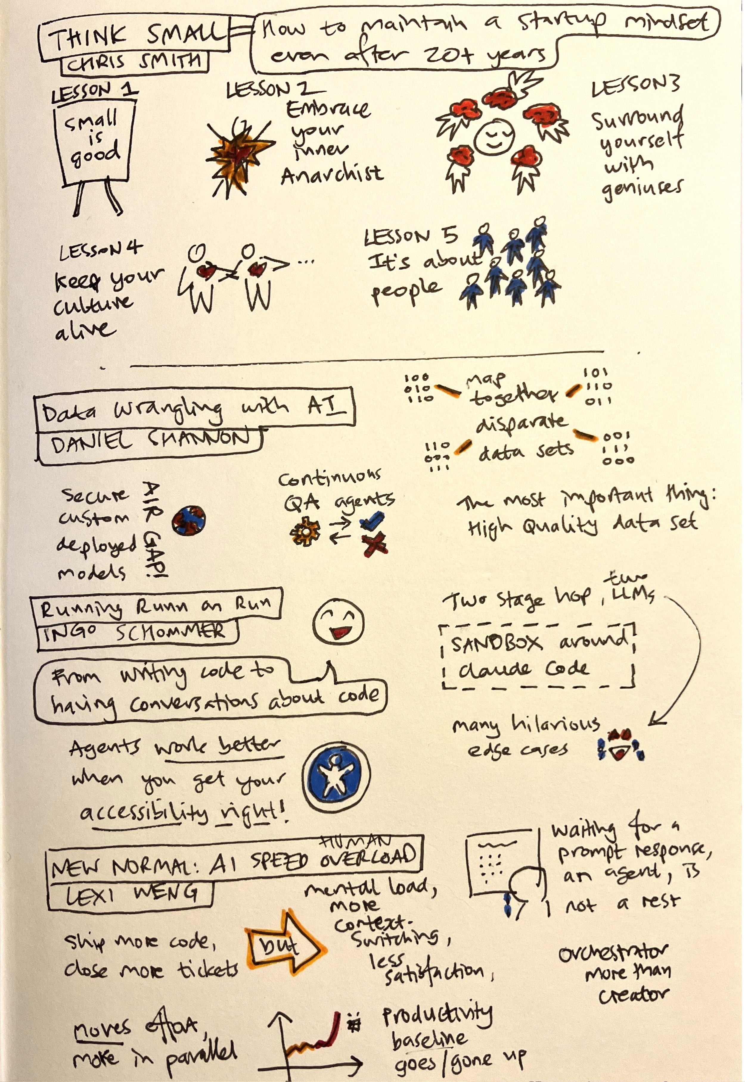Below are my sketchnotes from the talks I went to. Each image: links to a larger image; is followed by a text version.